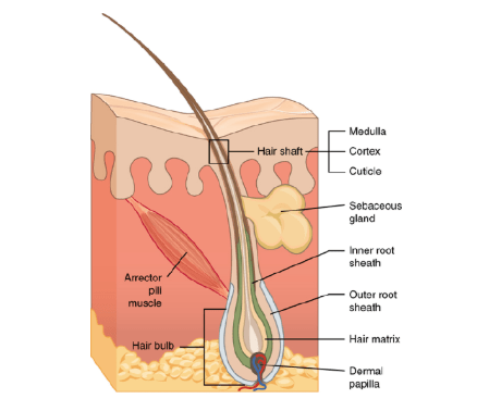 The hair follicle divides into regions: infundibulum (surface opening), isthmus (mid-portion), and inferior segment (bulb with matrix cells for hair growth). Terminal follicles extend into the subcutis for thick hairs, while vellus ones remain superficial. The arrector pili muscle attaches obliquely, enabling “goosebumps” for thermoregulation and sebum dispersion.